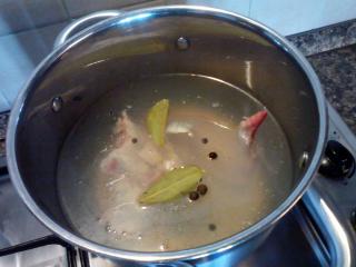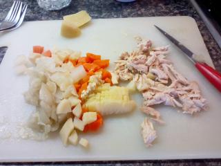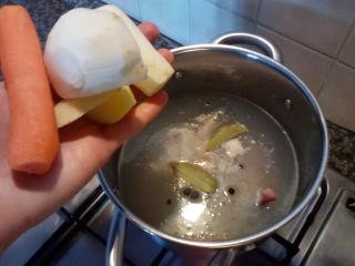 Kuřecí polévku vaříme alespoň hodinu, záleží na velikosti křídla. Jakmile je maso i zelenina měkká, všechno vyjmeme a z polévky vylovíme všechno koření, stáhneme plamen na minimum a necháme táhnout asi 20–30 minut, aby se zredukoval objem. Maso obereme a zeleninu nakrájíme na malé kostky. Asi polovinu si odložíme stranou a zbytek uchováme a použijeme na jiné jídlo.