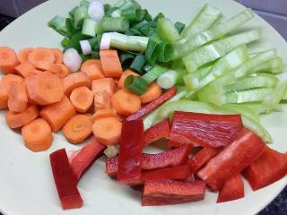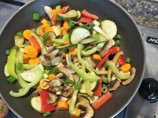 Nejprve si oloupeme cibuli, cuketu, žampiony a česnek. Cibuli i česnek nasekáme nadrobno. Na pánvi rozehřejeme olej a necháme na něm zpěnit cibuli, poté k ní přidáme i česnek. Cuketu nakrájíme na menší kostky. Papriky zbavíme semínek a spolu s rajčaty je nakrájíme na podobně velké kousky jako cuketu. Jarní cibulku nakrájíme na plátky.