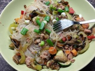 Mezitím přivedeme k varu vodu ve varné konvici. Do mísy nebo hlubokého talíře nasypeme skleněné nudle. Vroucí vodou je zalijeme, přiklopíme pokličkou a necháme několik minut odstát, přesné časové údaje naleznete na obalu. Jakmile jsou měkké, scedíme je a nasypeme na pánev k zelenině, zakápneme olivovým olejem a necháme společně krátce restovat. Nakonec ještě dochutíme kořením a hořčicí a podáváme.