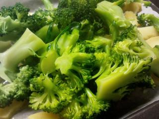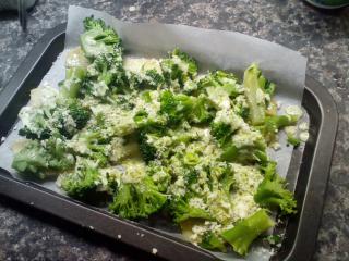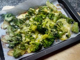 V prvním kroku si přichystáme brokolici. Rozebereme ji na růžičky, odstraníme ovadlé kousky a lístečky. Brokolici propereme. V hrnci přivedeme k varu vodu, osolíme ji a růžičky brokolice do ní naházíme. Vaříme asi 5 minut, poté scedíme. Vývar můžeme použít jako základ pro zeleninovou polévku. Mezitím si můžeme připravit brambory, oloupeme slupku, pokud máte nové brambory, stačí jen důkladně odrhnout, nemusíte je zbavovat slupky. Následně je překrojíme na poloviny a nakrájíme na tenké plátky. Plech potáhneme pečicím papírem, brambory na něj poklademe v jedné vrstvě. Přidáme brokolici. Troubu předehřejeme na 200 °C.