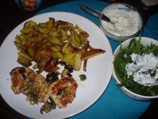 Bylinkové kuřecí plátky s pečenými bramborami a rukolovým salátem | recept. Kuřecí na minutku patří k jedněm z nejjednodušších a nejrychlejších úprav masa. Inspirujte se následujícím receptem z kuřecího masa, je plný voňavých čerstvých bylinek, které masu dodají skvělou chuť. Kuřecí plátky jsou doplněné pečenými bramborami a jednoduchým salátem z rukoly. Není nic jednoduššího pro letní obědy nebo večeře, kdy nechceme ztrácet drahocenný čas v kuchyni.