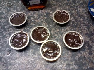 Mezitím se pustíme do přípravy polevy. Obě čokolády nalámeme na kostičky, přidáme nakrájené máslo a rozpustíme nejlépe ve vodní lázni. Za stálého míchání se nám rozpustí všechny suroviny a spojí se v jednu hladkou směs. Poté ji stáhneme z plamene a necháme krátce zchladnout. Jakmile začne od okrajů tuhnout, vyjmeme košíčky z lednice a do každého nalijeme čokoládu až po okraj.