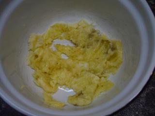 K banánu nasypeme vystydlé vločky, přilijeme citronovou šťávu a přisypeme kůru. Následně přilijeme med a důkladně zpracujeme na těsto. Pokud by se vám zdálo, že je těsto příliš drobivé, můžeme přilít trochu mléka. Případně, pokud by těsto bylo naopak příliš tekuté, lze přidat ještě trochu vloček, záleží i na velikosti banánu.