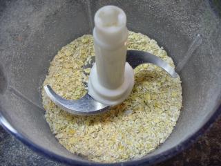 Ovesné vločky umeleme najemno. Případně můžete rovnou koupit ty, které jsou obvykle označované jako jemné. Menší pánev rozehřejeme a opražíme na ní vločky nasucho a necháme je zcela vychladnout.