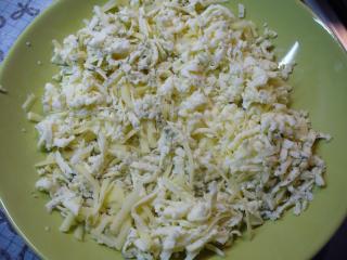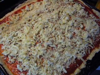 Zatímco nám kyne těsto, připravíme si sýrovou náplň. Mozzarellu slijeme z nálevu a nastrouháme na hrubém struhadle, stejně jako nivu a eidam, vše společně promícháme. Rajčatovou pasátu smícháme se lžičkou cukru, to kvůli ostré chuti, pokud Vám však nevadí, můžete cukr vynechat. Dále přisypeme koření na pizzu, množství zvolte dle chuti.