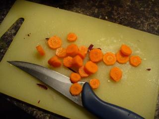 Následně oloupeme a omyjeme mrkev a nakrájíme ji na tenká kolečka. Následně ji přidáme k ostatním ingrediencím.