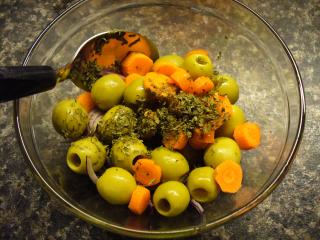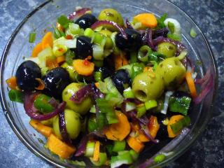Pikantní salát z nakládaných oliv | recept. Olivy se většinou používají na ozdobu nebo jen jako doplněk salátů a dalších pokrmů. V tomto receptu jsou však hlavní chuťovou složkou. Ideální je zkombinovat olivy černé i zelené, případně můžete použít i plněné olivy, např. paprikou. Dále se v receptu uplatňuje červená cibule i jarní cibulka, salátu dodají jak na štiplavosti, tak na svěžesti. Další ingrediencí je mrkev, která hraje i estetickou roli, krásně se barevně doplňuje s olivami. O pikantnost se postará chilli pasta, s níž však opatrně, aby nepřebila všechny ostatní chutě. Nesmí chybět ani olivový olej a bylinky, v našem případě se skvěle hodí oregano, v tomto ročním období samozřejmě sušené, to salátu dodá i dobrou vůni.