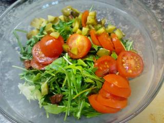 Rukolový salát se sušenými rajčaty | recept. Rukola má lehce štiplavou chuť, která se dobře kombinuje s klasickým hlávkovým salátem, který může mít pro někoho naopak mdlou chuť. Podle následujícího receptu si můžete připravit rychlý salát neotřelé chuti, který je jednoduchý na přípravu a nevyžaduje ani příliš extra ingredience. Dále do salátu patří třešňová rajčátka a kyselé okurky. Základem zálivky je vinný ocet, olivový olej a citronová šťáva. Poměrně netradiční ingrediencí jsou sušená rajčata. Salátu korunuje parmezán a mleté ořechy, které mu dodají nezaměnitelnou chuť.