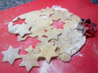 Následně pomoučněte vál a rozválejte na něm těsto na plát asi tak silný jako na štrúdl. Z těsta vykrájejte hvězdičky či jiné tvary a přeneste je na plech vyložený pečicím papírem nebo vymazaným tukem.