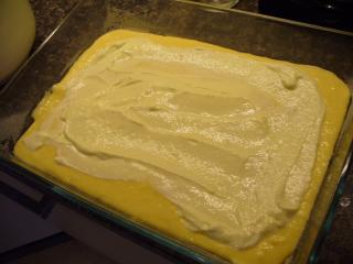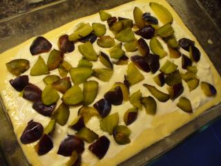 Nejprve si připravíme piškotové těsto. Do hlubší mísy nasypeme cukr a rozklepneme opatrně obě vejce, ty pak ušleháme do pěny, následně přilijeme olej a po částech zapracujeme prosátou polohrubou mouku smíchanou s kypřicím práškem. Těsto zředíme opatrně vodou a rozetřeme jej na plech vyložený papírem na pečení. Následně si přichystáme tvarohovou náplň. Tvaroh vyklopíme do mísy, smícháme s cukrem, případně s vejcem a prošleháme metličkou. Pokud by se nám zdálo, že je nádivka příliš hustá, tak ji můžeme rozředit trochou mléka. Následně pak nádivku rozdělíme ve vrstvě na těsto.