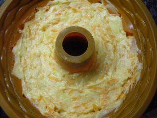 Přidejte nastrouhanou mrkev, jablko a zamíchejte je řádně do těsta. Možná se vám bude zdát málo těsta na tolik mrkve, ale díky tomu bude bábovka báječně vláčná. Pokud nepoužíváte silikonovou formu na bábovku, tak nádobu vymažte máslem a vysypte hrubou moukou. Osobně dávám přednost té silikonové, kterou před použitím ještě lehce vypláchnu vodou. Nakonec nalijte veškeré těsto do formy a uhlaďte povrch.
