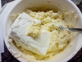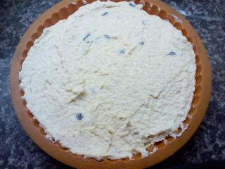 V jiné míse vyšleháme vejce s cukrem do pěny. Následně vaječnou pěnu nalijeme k bramborovo-jáhlové směsi, přidáme oba tvarohy, vanilkovou esenci, rozinky a kůru z citronu a důkladně promícháme. Formu na koláč vymažeme tukem a vysypeme moukou, používám silikon, kde to není třeba a koláč se upeče stejně dobrý.
