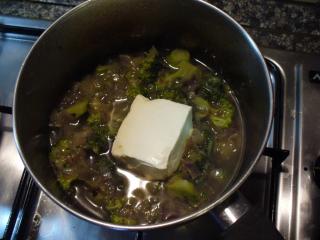 Mezitím rozdělíme brokolici na menší růžičky a propláchneme pod vodou. Když cibule zesklovatí, přidáme do hrnce brambory a brokolici. Zeleninu necháme ještě krátce restovat. Potom zalijeme vodou tak, aby byla celá ponořená, přiklopíme pokličkou a přivedeme k varu. Po pěti minutách vaření polévku osolíme a opepříme, přidáme trochu muškátového květu.