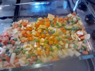 Pohanka nám mezitím nabobtnala, ponecháme ji v té samé vodě, vložíme ji na sporák, přiklopíme pokličkou a přivedeme k varu. Většinou stačí 5 minut vaření a pohanka je měkká, vše však záleží na délce namáčení. Pokud spěcháte, pohanku rovnou uvařte, trvá to však přibližně 20 minut. Jakmile je pohanka uvařená, stáhneme ji z plamene a necháme pod pokličkou dojít. Mražený hrášek propláchneme a asi po 15 minutách pečení, přidáme do pekáčku k zelenině.