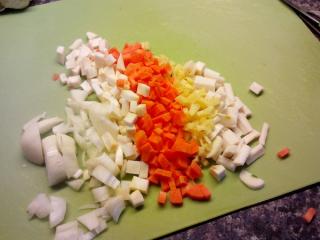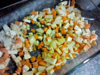 Nejprve si propláchneme a namočíme pohanku, stačí asi půl hodiny. V mezičase si připravíme zeleninu. Troubu rozehřejeme na 200 °C. Cibuli oloupeme a nakrájíme nadrobno. Mrkev, petržel, celer a zázvor oloupeme. Kořenovou zeleninu nakrájíme na drobné kostičky. Zázvor nasekáme najemno, případně ho můžeme i nastrouhat.