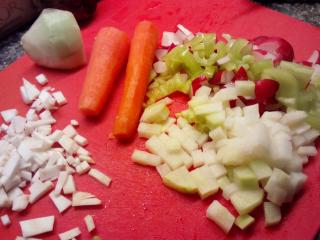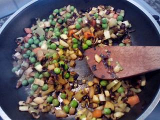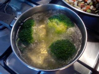 Když je zelenina téměř hotová, přidáme hrášek a necháme ho změknout. Než se dovaří rýže a dopeče řepa, natrháme si bylinky, skvěle se hodí libeček nebo majoránka, případně jejich kombinace. Propereme je a nasekáme nadrobno. Uvařenou brokolici nasekáme na drobné kousky a přidáme je na pánev k ostatní zelenině.