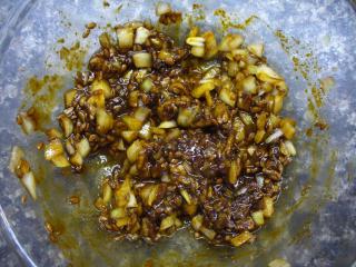 Poté si připravíme zálivku. Česnek očistíme a prolisujeme do menší misky nebo do hrnečku, smícháme ho s paprikou, semínky, sójovou omáčkou a olivovým olejem. Pokud neholdujete ostrým pokrmům, tak snižte množství pálivé papriky nebo pokrm dochuťte sladkou paprikou. Všechny ingredience důkladně promícháme tak, aby se správně spojily.