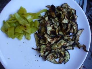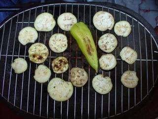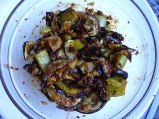 Grilovaný lilek nakrájíme na proužky. Popřípadě můžeme jednotlivá kolečka zbavit slupky. Z papriky oloupeme zčernalou slupku a také ji nakrájíme na proužky. Takto připravenou zeleninu vsypeme do mísy k přichystané zálivce. Zálivku se zeleninou pak lehce promícháme, aby se jí obalily a ochutily všechny suroviny.