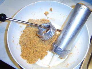 Na masový strojek připevníme lištu s vroubkovaným otvorem, eventuálně do „stříkačky“ upevníme nástavec s větším vroubkovaným otvorem. Nástroj naplníme těstem. Mletím (respektive tlakem na píst) vytváříme válečky, které můžeme dál libovolně tvarovat: tyčinky, kroužky, „brejle“, ale v případě potřeby třeba i písmena nebo číslice. Klademe na suchý plech.