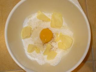 Mezitím se pustíme do přípravy korpusu na citronový koláč. Na vál nebo do větší mísy nasypeme všechnu mouku smíchanou s kypřicím práškem a citronovou kůrou, rovnoměrně rozmístíme kousky rozměklého tuku, cukr a doprostřed této směsi umístíme vaječný žloutek.