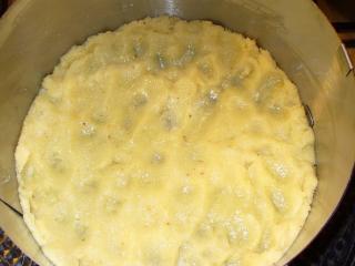 Ze všech surovin vypracujeme tužší těsto. Připravíme si koláčovou formu o průměru 30 centimetrů. Tu pouze lehce vymažeme a těsto do ní vmačkáme, okraje trochu přizvedneme, aby nám pak náplň nepřetekla. Korpus vložíme do trouby vyhřáté na 180 °C a necháme trochu předpéct, přibližně 15 min.