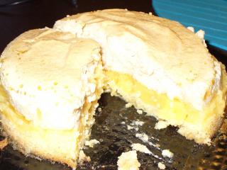 Mezitím se nám téměř upekl korpus. Měl by být pouze lehce nazlátlý. Vyjmeme ho z trouby, pokryjeme pudinkovou náplní a navrch opatrně a s trpělivostí navršíme vyrobenou sněhovou čepici. Máme téměř hotovo.