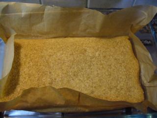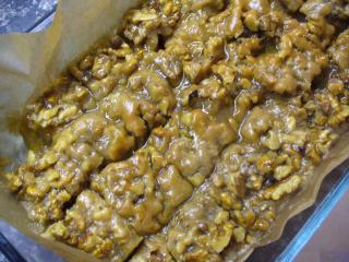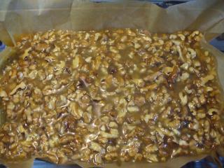 Řezy pečeme ještě dalších 25 minut, musíme dát pozor, aby karamelová směs nezačala hnědnout. Pak formu opatrně vyjmeme z trouby, na povrchu řezy ještě nebudou zcela zatuhlé. Necháme je úplně vychladnout. Nakonec upečený plát nakrájíme na malé kousky.