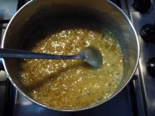 Ke karamelu vmícháme smetanu a rum. Je možné, že vám karamel začne lehce bublat. Směs mícháme do hladké hmoty. Do ní nakonec přidáme opražené nasekané vlašské ořechy. Když je těsto upečené nalijeme na něj opatrně připravenou karamelovou hmotu.