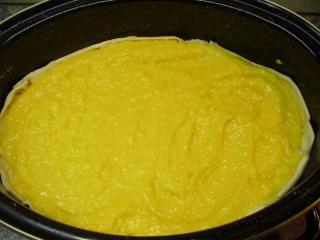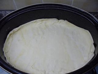 Nejprve si předehřejeme troubu na 180 °C. Listové těsto vyválíme na velikost běžného pekáče. Pekáč vyložíme pečícím papírem (popřípadě ho můžeme vymazat tukem a posypat hrubou moukou). Vyválené těsto přeneseme do pekáče a trochu přizvedneme okraje (koláč jsem pro tyto účely připravovala z poloviční dávky, použila jsem proto menší pekáč).