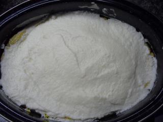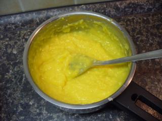 Poté dáme vařit tři čtvrtiny mléka a ve zbytku rozmícháme oba pudinky a přidáme cukr. Můžeme dát i méně cukru,než je uvedeno, záleží na naší chuti. Když se mléko začne vařit, vlijeme do něj rozmíchané pudinky a vše důkladně mícháme, než se směs zahustí. Do ještě teplého pudinku vmícháme máslo a vanilkový cukr, necháme lehce vychladnout. Mezitím si oddělíme 4 žloutky od bílků, které vlijeme do samostatné nádoby. Žloutky a 1 celé vejce přidáme do pudinkové směsi. Důkladně prošleháme metličkou, můžeme použít i elektrický mixér. Mícháme nebo šleháme, dokud nám nevznikne hladký krém.