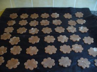 Odležené těsto vyjmeme z ledničky a připravíme si vál. Ten lehce poprášíme moukou a těsto na něm vyválíme přibližně na půlcentimetrový plát. Z těsta vykrajujeme kytičky, které následně přeneseme na plech.