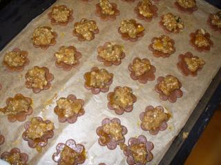 Žloutek lehce prokvedláme vidličkou a potřeme jím připravené kytičky. Krokantovou směs naneseme do jejich středů. Kytičky pečeme přibližně 20 minut. Nechte si chutnat.