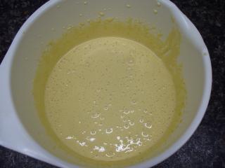 Nejprve si připravíme těsto. Do větší mísy rozklepneme dvě vejce. Ty vyšleháme se třtinovým a vanilkovým cukr do pěny, trvá to asi 10 minut. Můžeme samozřejmě použít i běžný bílý cukr, ale třtinový má lepší chuť a v neposlední řadě je také zdravější.