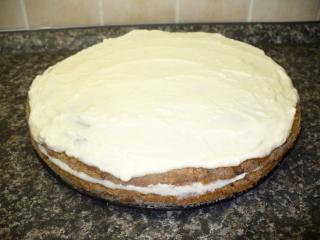 Vychladlý korpus rozřízneme opatrně na půl, horní půlku přesuneme na připravený talíř. Dvě třetiny tvarohového krému natřeme na spodní díl korpusu, který přiklopíme odloženou horní půlkou. Zbylý krém důkladně rozetřeme na vrch (viz ilustrační fotografie).
