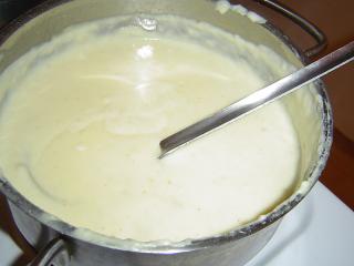 Vzniklou bešamelovou omáčku důkladně provaříme (asi deset minut). Neměly by v ní být hrudky jíšky. Pak přilijeme kelímek poctivé sladké smetany (tak zvaně ke šlehání), přivedeme k varu a zkorigujeme hustotu: když je omáčka řídká, zahustíme je ještě lžicí mouky rozkvedlané v troše vody nebo mléka. Příliš hustou omáčku trochu zředíme (vývarem, vodou, mlékem). Přidáme tři vrchovaté lžíce strouhaného čerstvého nebo konzervovaného křenu a necháme „překulit“ varem.