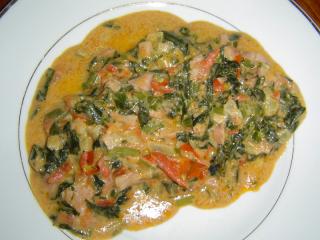 Omáčka s medvědím česnekem na těstoviny Drobně nakrájenou cibuli a na delší jemné hranolky nakrájenou šunku nebo šunkový salám společně opékáme na másle. Pak přidáme nasekaná rajčata, malou špetku sušeného tymiánu a rajčata krátce podusíme. Přidáme nasekaný česnek, přisolíme a společně několik minut dál dusíme. Nakonec vmícháme zakysanou smetanu a necháme prohřát. Podáváme s těstovinami. Obměna: Když do pokrmu přidáme karí koření, je vhodnou přílohou i rýže.